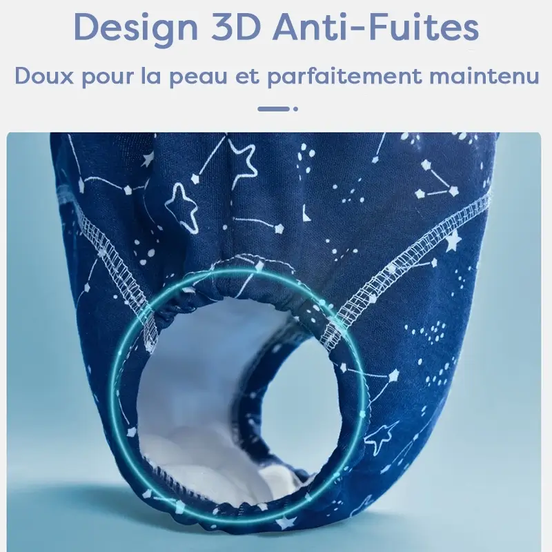 Première couche : ne masque pas l’humidité, permet à l’enfant de ressentir les accidents pour mieux apprendre tout en évitant les fuites.
